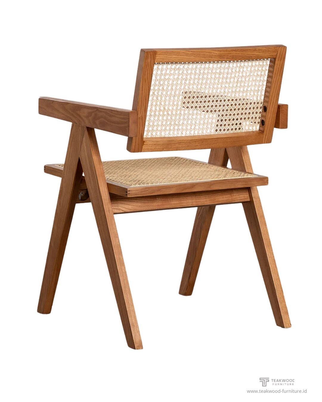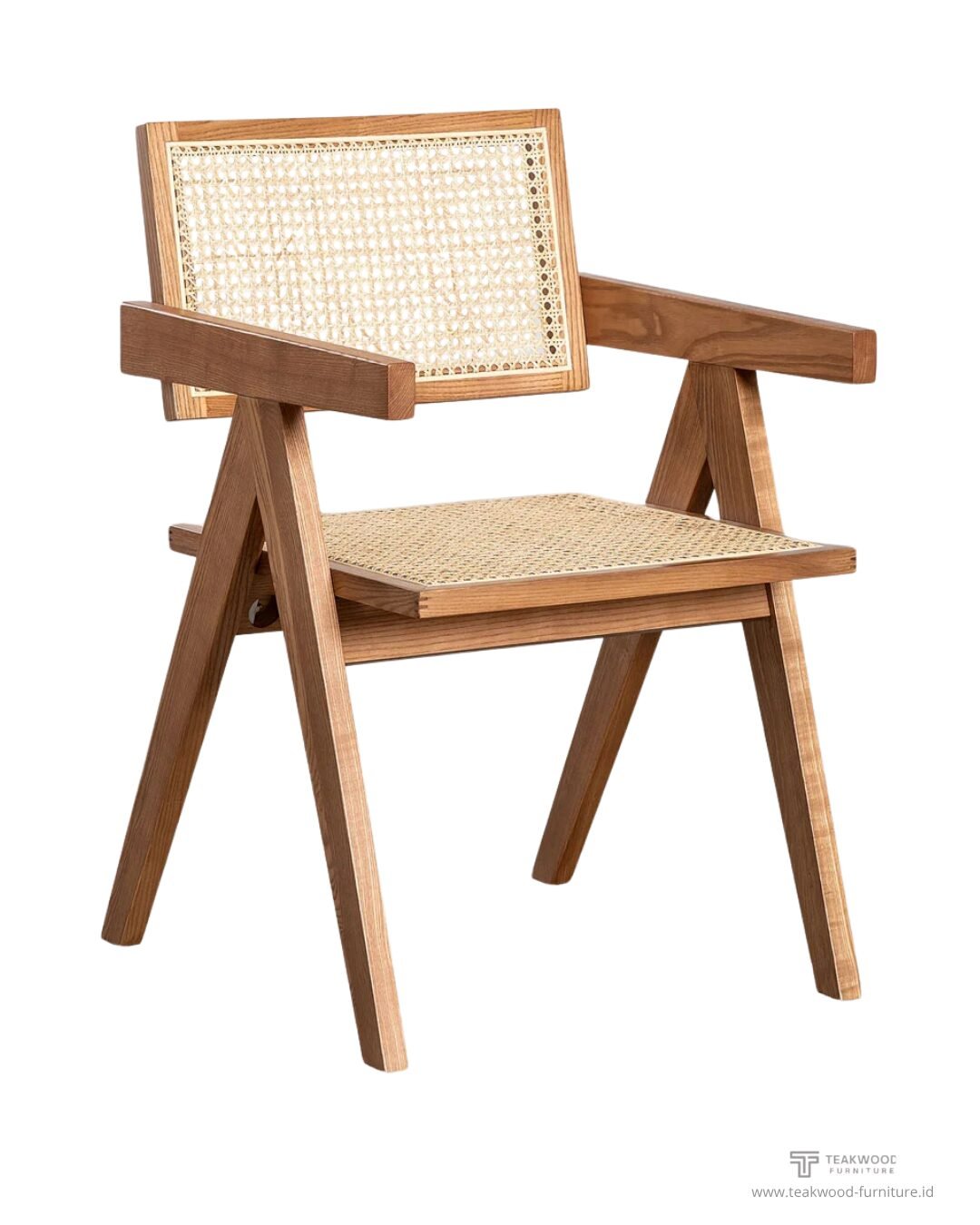 Nama Produk Kursi Lengan Struktural Minimalis dengan Anyaman Rotan (Contoh: “The Jeanneret Cane Chair” atau “The V-Leg Chair”)